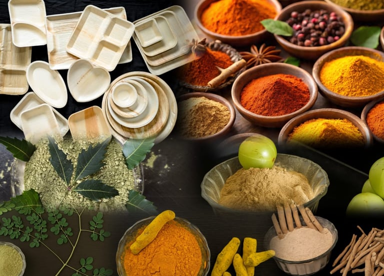 "Shop eco-friendly Areca leaf plates, Fresh Fruits & Vegetables, and pure Indian spices – 100% natural, sustainable, and perfect for export use."